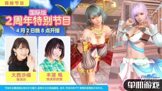 除了游戏外,为纪念服务开始2周年,4月2日晚上8点将于虎牙进行国际版首次的 WEB节目「《死或生:沙滩排球 女神假期》国际版2周年特别节目」。当天邀请了饰演环的「大西沙织」、饰演菲欧娜的「本渡枫」。和豪华来宾一同迎接 2 周年的盛事吧。
