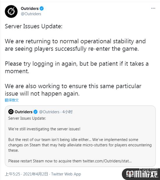 今早,《先驱者》官方在推特中连发声明,表示目前正在对服务器情况进行紧急修复。目前,新的补丁程序已经上线,该补丁旨在修复程序崩溃、服务器无法登陆等问题,玩家可以前往各大平台进行更新。