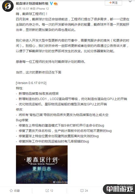 《戴森球计划》0.6.17.6112更新内容公开,新增物品掉落/拾取系统框架、制造台的LOD1,LOD2渲染细节等级,优化制造台渲染在GPU上的开销两项功能,修复了一些BUG。