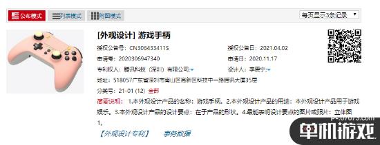 国家知识产权局今日公开了腾讯申请的一项“[外观设计] 游戏手柄”专利,腾讯于2020年11月17日申请。