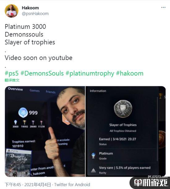 Hankoom在推特上晒出了自己的奖杯数截图,并附言:“白金3000。《恶魔之魂》。奖杯猎手。很快会在油管上上传视频。”