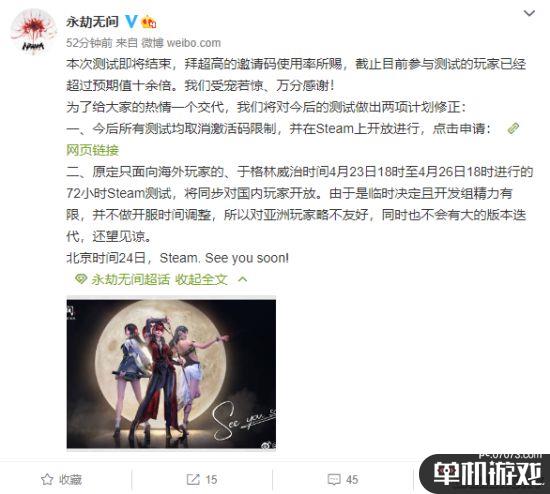 在微博中,《永劫无间》的官方对先行测试期间玩家们的热情做出感谢,并表示此次的测试玩家数量超过了预期十倍。为了回应玩家们的热情,原本定于格林威治时间4月23日18时至4月26日18时进行,只针对海外玩家进行的72小时测试,也会同步对国内玩家开启。