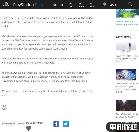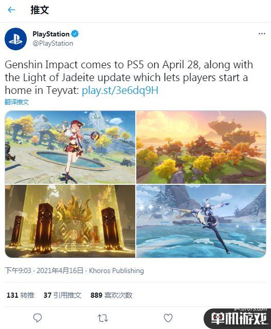 PlayStation官推宣布《原神》将于4月28日登陆PS5平台。