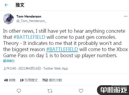 今日早些时候,知名爆料人Tom Henderson(曾用名LongSensation)发推称:目前没有消息显示《战地6》会登陆PS4和Xbox One平台。并且他推测为了提高玩家数量,游戏可能会首日加入XGP。