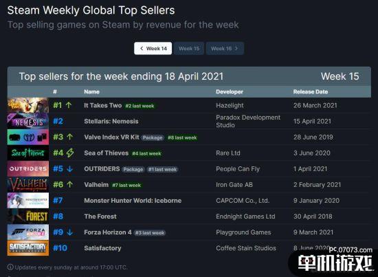 V社公开了上一周(4月12日至4月18日)的Steam销售排行榜,《双人成行》登顶榜单,第二名则是《群星》新DLC“Nemesis”。