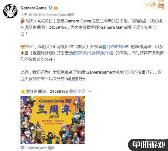 明天(4月20日)就是Gamera Game成立三周年的日子啦。明晚8点,我们将在虎牙直播间:24589186,为大家隆重呈现“Gamera Game闹”三周年特别节目!