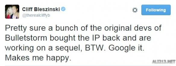 Epic Games原游戏总监,业界著名人物Cliff Bleszinski近日发Twitter表示,由其领衔的《子弹风暴(Bulletstorm)》团队即将发布新作。