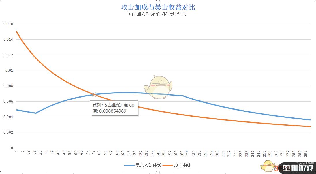 1.交点(x=80,y=0.006865),对应:攻击力120%;对应双暴55/110
