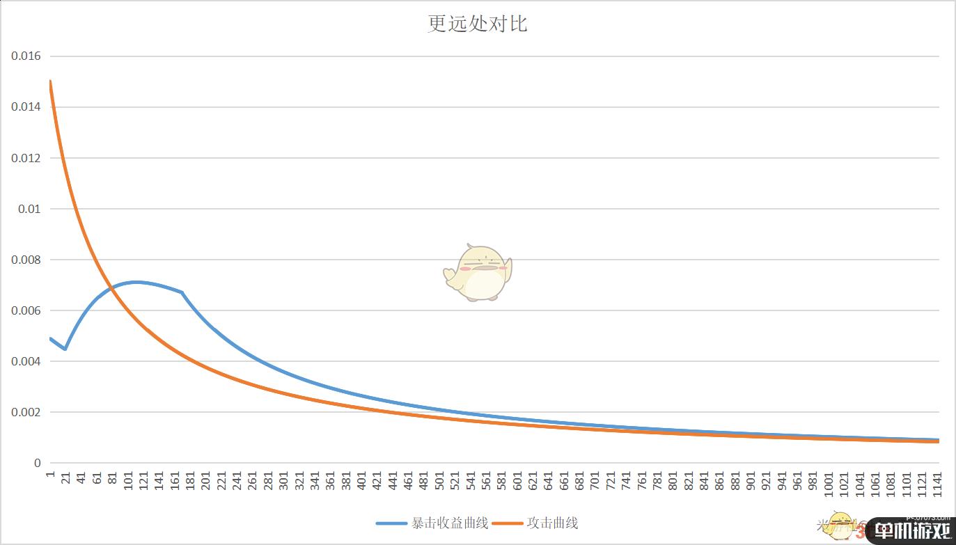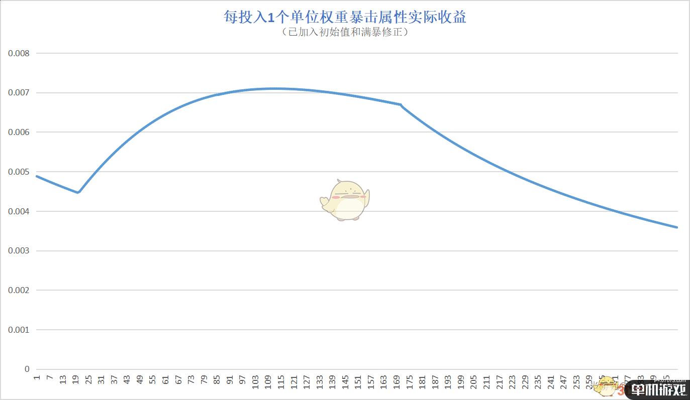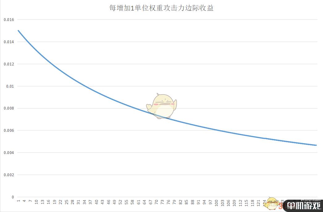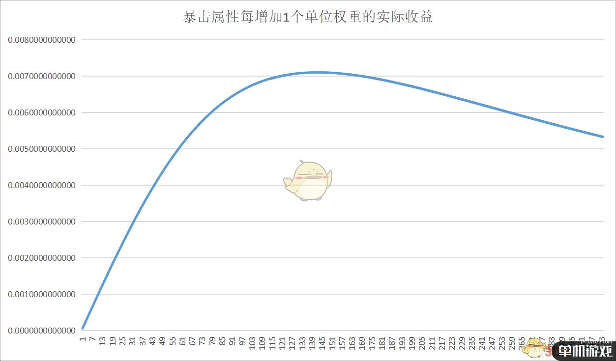 以下曲线都是按每投入1个单位权重所获得的边际收益点阵拟合而成的,而一般习惯性地将1%暴击率所占权重作为单位权重,此时1单位权重对应1.5%攻击力加成,再由攻击力曲线无限靠近0时,边际收益的极限为1.5%,与1.5%攻击力加成正好吻合,所故以此作为判断标准。
