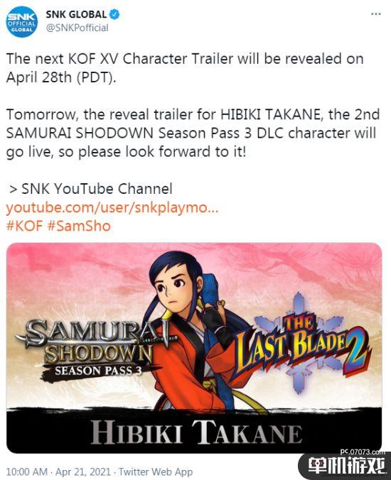 今日SNK官方宣布《拳皇15》新角色预计将于4月29日公布,明天将公布《侍魂:晓》与《月华剑士2》的联动角色“ 高岭响 ”的预告片。