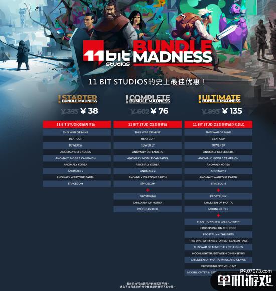 这次庆祝活动的第三部分,也是最重要的部分,是三款新鲜出炉的优惠捆绑包!这些捆绑包几乎涵盖了11bit所有的游戏,从最经典的作品到内容,以最“跳楼”的折扣提供,当你以捆绑包方式购买时甚至有60%的额外折扣!下面是每个包的详细介绍: