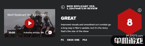 IGN给出了重制作品《尼尔:伪装者 ver.1.22474487139...》8分的评价,测评者认为:本作的惊喜无处不在,角色令人难忘,情感在脑海中产生共鸣,且久久不能消散。