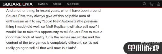 “近年来,当我出现在SE时,他们总是散发出一种明显的热情气氛,好像在说:‘看!《尼尔:机械纪元》做得很好,所以《尼尔:伪装者》现在也可以大卖了。’我想借此机会告诉SE好好认清现实。它们俩只是名字像,本质上的内容截然不同,所以现在真的不会卖得那么好,对吧?”
