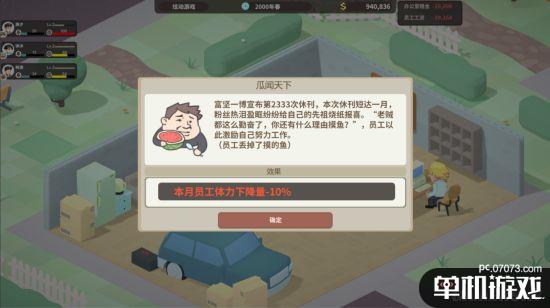 由三名大学生开发的单机游戏公司模拟器《老板,游戏凉了!》今天正式登陆Steam,游戏定价22元,首周折扣降至19元,各位怀揣着做游戏梦想的玩家可以进入游戏打造专属于你们的游戏帝国了!在游戏中,你将会遇到想为你游戏免费写祝贺词的黄旭西,前来应聘但是“不会数三”的中年胖子,也会遇到《塞车朋克3077》的强势发售和将你游戏免费发布的”五大娘“。最后,你将带着你的专属记忆穿越回20年前,你是否能够避开所有行业大坑,在蓝海时期乘风而起称王称霸?
