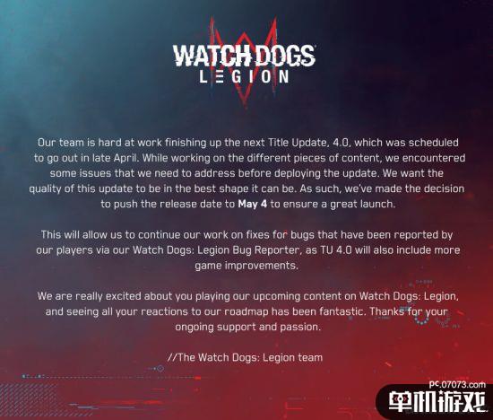 育碧宣布,《看门狗:军团》更新“4.0”将推迟于5月4日发布。原计划于四月份上线更新,但团队遇到一些问题,需要更多时间进行处理解决。