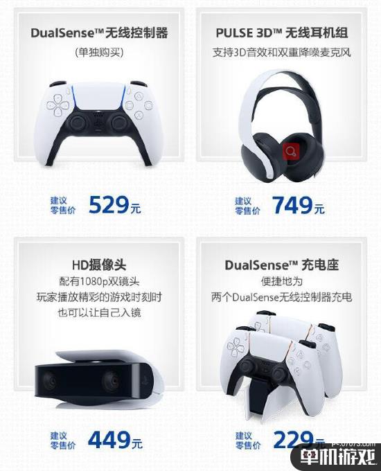 此外配件国行价格也一同公布:DualSense无线控制器(单独购买)建议零售价529元、PULSE 3D无线耳机组建议零售价749元、HD摄像头建议零售价449元、DualSense充电座建议零售价229元。