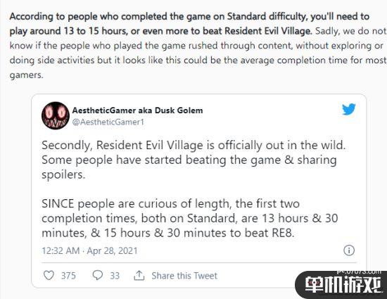 也许已经有玩家拿到了《生化危机8》的偷跑,并已经通关,然后还透露了粗略的游戏通关时间。