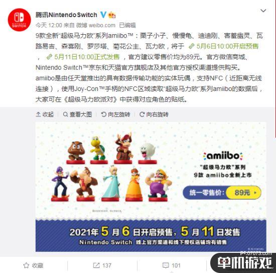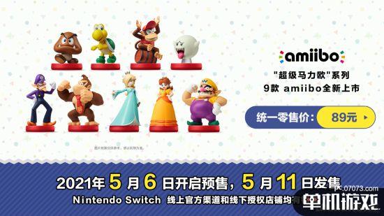 9款全新“超级马力欧”系列amiibo:栗子小子、慢慢龟、迪迪刚、害羞幽灵、瓦路易吉、森喜刚、罗莎塔、菊花公主、瓦力欧,将于O5月6日10:00开启预售,O5月11日10:00正式发售,官方建议零售价均为89元。官方微信商城、NintendoSwitch京东和天猫官方旗舰店及其他官方授权渠道提供购买。