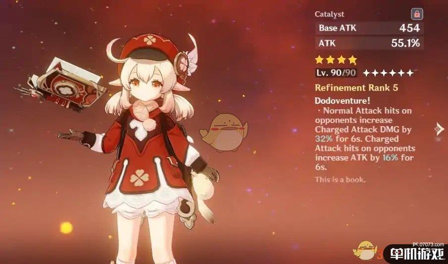 这本法器就差将可莉脸印在上面了,姑且称其为“可莉专武”。90级属性454攻击力,55.1%攻击力加成,5精被动:普通攻击命中敌人6秒内,重击造成的伤害提升32%,重击命中敌人的6秒内,攻击力提升16%。