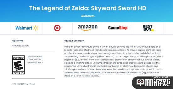 娱乐软件分级委员会(ESRB)近日公开了完整的《塞尔达传说:天空之剑HD》的分级信息,ESRB将本作分为E级(适合10岁或以上年龄的玩家),包含动画血液、滑稽以及幻想暴力元素。