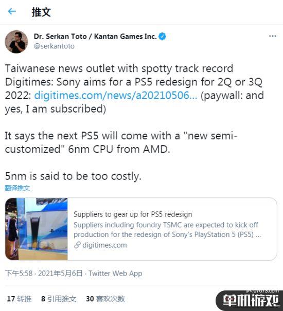 另一方面半导体零部件供给侧的业内人士向Digtimes透露,供应商(包括台积电)可能会在2022年第二至第三季度参与重新设计PS5的内部结构,将CPU改为新型定制的6nmCPU,以此来节省成本并提高产量。