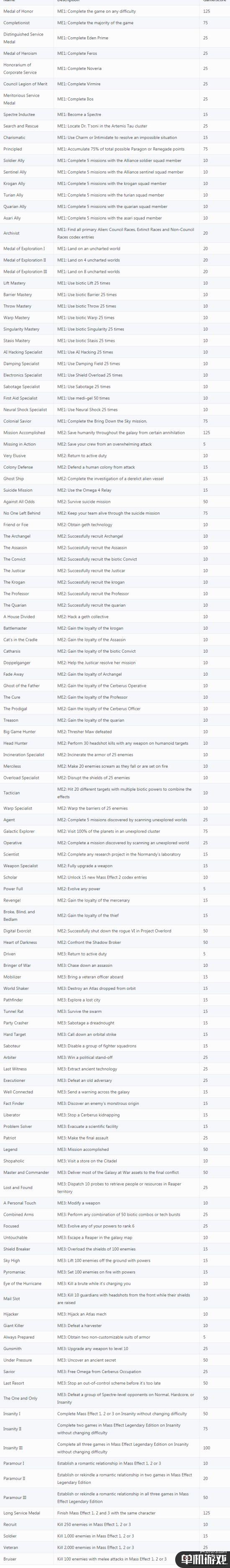 昨晚,国外成就统计网站TrueAchivements曝光了《质量效应:传奇版》Xbox版的成就列表。