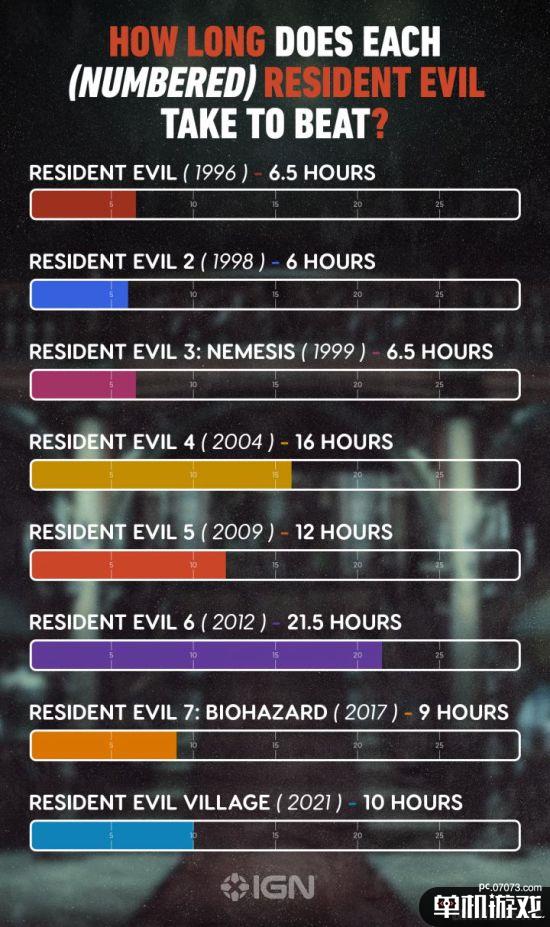 往后依次是《生化危机7》——9小时、《生化危机3》和《生化危机》——6.5小时、《生化危机2》——6小时。