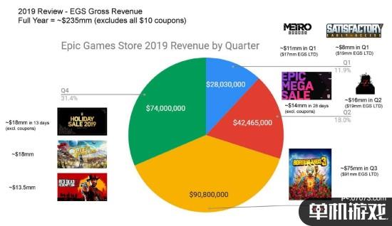 第三季度发售的Epic限时独占作品《无主之地3》收入占比高达38.6%;而R星爆款巨作《荒野大镖客2:救赎》以及同样限时独占的黑曜石工作室新作《天外世界》则支撑起了第四季度的商城收入。