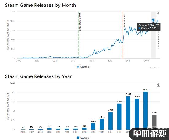 据该功能显示:在整个2020年,Steam平台新增游戏超过10000部,这也是自2006年至今新游戏上架最多的一年,而2020年10月也是该年份新游戏发售最多的月份——该月共有1033部新作上线;近期排名第二的则是今年3月份,共有1026部新作上线。