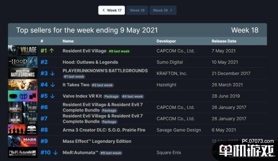 V社公开了上一周(5月3日至5月9日)的Steam销售排行,《生化危机8:村庄》登顶榜单,第二第三名则分别是《绿林侠盗:亡命之徒与传奇》、《绝地求生》。