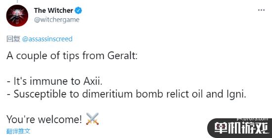 巫师官方推特顺势来评论区玩梗,表示这个角色不怕亚克席法印这种魅惑技能,不过它弱反魔法金属炸弹和残物油,还能用伊格尼法印对付它。完全就是《巫师3》里打鹿首精的玩法。