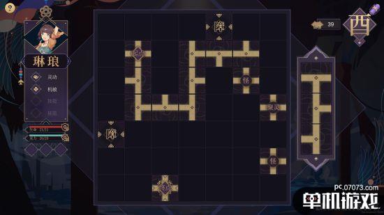 游戏中的探索地图采用随机生成的方式,7乘7方格中散布着起点、怪物点、聚灵点、障碍点和终点。玩家需要移动地图右侧随机刷新的三个不同方向的地砖,从起点行至终点。行进过程中无标记的地块会触发多种不同类型的事件。