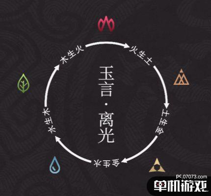 汲取于传统五行学说,《玉言·离光》中的卡牌具有金、木、水、火、土五种属性, 游戏采用回合制玩法,玩家对怪物使用五行卡牌进行伤害攻击时,会将其属性标记在怪物身上,同一时间怪物只会拥有一种标记。根据五行相生的原理,当使用相生属性的卡牌再一次攻击怪物时,会触发额外的增益效果。举个例子,水生木者,一回合中当玩家对有水属性标记的怪物使用木属性攻击时,可以回复灵力值。同一回合打出两张水属性的卡牌,还能立即从牌堆抽出一张下位木属性的卡牌。