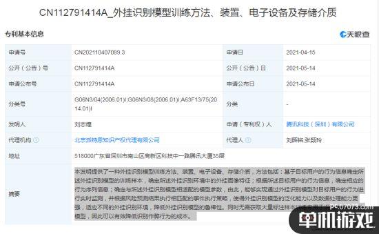 腾讯今天公布了名为外挂识别模型训练方法、装置、电子设备及存储介质的专利。显示申请日期为今年4月15日,专利号为CN112791414A,已在天眼查网站上可查。