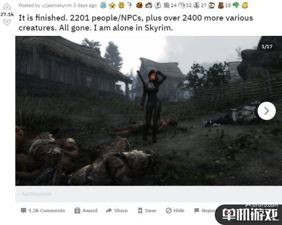 Reddit上,名为Jaeinskyrim的玩家在一系列的MOD下完成了击杀所有活物的惊人成就。根据他的计数,他击杀的总共有2201个人/NPC,加上2400多种生物。