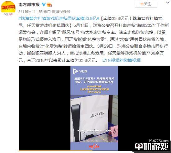 南方都市报报道称,“5月14日,珠海公安召开打击走私“海啸2021”工作新闻发布会,详细介绍了“飓风18号”特大水客走私专案。该案走私链条完整,以贸易物流形式报关入澳门,再理货拆货“化整为零”,通过“水客”通关团伙带货入境,在境内收货时“化零为整”转运给货主团伙。3月29日,珠海公安联合多地市同步行动,抓获犯罪嫌疑人54人,查扣涉嫌走私索尼、任天堂等游戏机价值7780余万元,查证2018年以来累计案值约33.8亿元。”