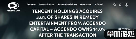 Remedy Entertainment今天发布官方公告:腾讯公司从从Accendo Capital处收购了Remedy公司3.8%的股份。