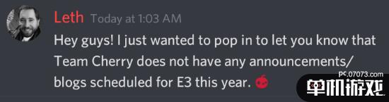《空洞骑士》开发商Team Cherry的市场营销负责人Leth今日确认,工作室不会在今年E3期间公开任何新情报或博文。