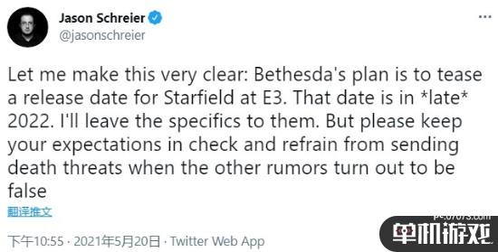 Jason Schreier前日在推特发文称,Bethesda计划在E3上对《星空》的发售日进行“预告(tease)”,这个日期是在2022年下旬(late 2022)。“具体的细节我就留给他们来了。但还请理性地保持期望,如果其他传言被证实是假的,请别发出死亡威胁。”