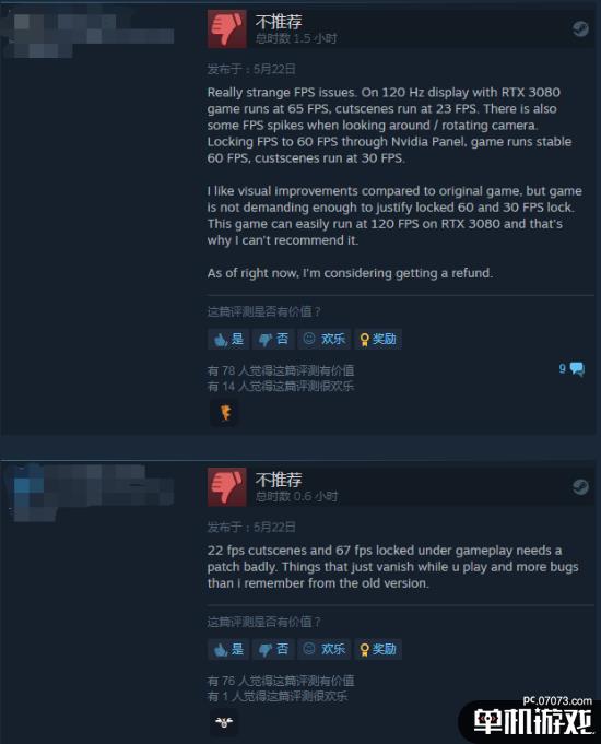 而为本作给出差评的玩家则表示:本作的锁帧情况过于严重,还有玩家声称游戏的过场动画还出现了掉帧现象,甚至有好评玩家表示在游戏中还发现了不少影响游戏体验的Bug……