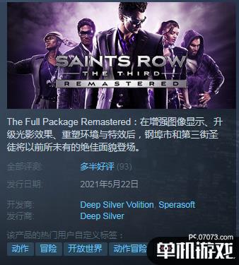 由Deep Silver Volition、Sperasoft制作、Deep Silver发行的《黑道圣徒3:复刻版》已于今日正式上架Steam平台,限时特惠117元,暂不支持中文。截止发稿前,共有93名玩家给出评价,好评率为75%。