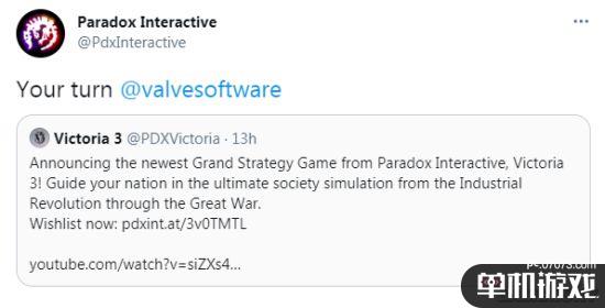 P社发行商的推特转发了《维多利亚3》的推特,还饶有兴致的艾特上了V社官推说道:“该你了”。言外之意很明显,V社你的《半条命3》和《求生之路3》搞快点啊!
