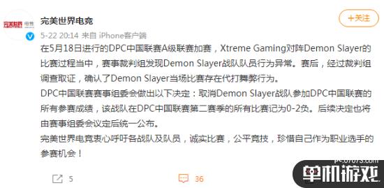 取消Demon Slayer战队参加DPC中国联赛的所有参赛成绩,该战队在DPC中国联赛第二赛季的所有比赛记为0-2负。后续决定也将由赛事组委会议定后统一公布。